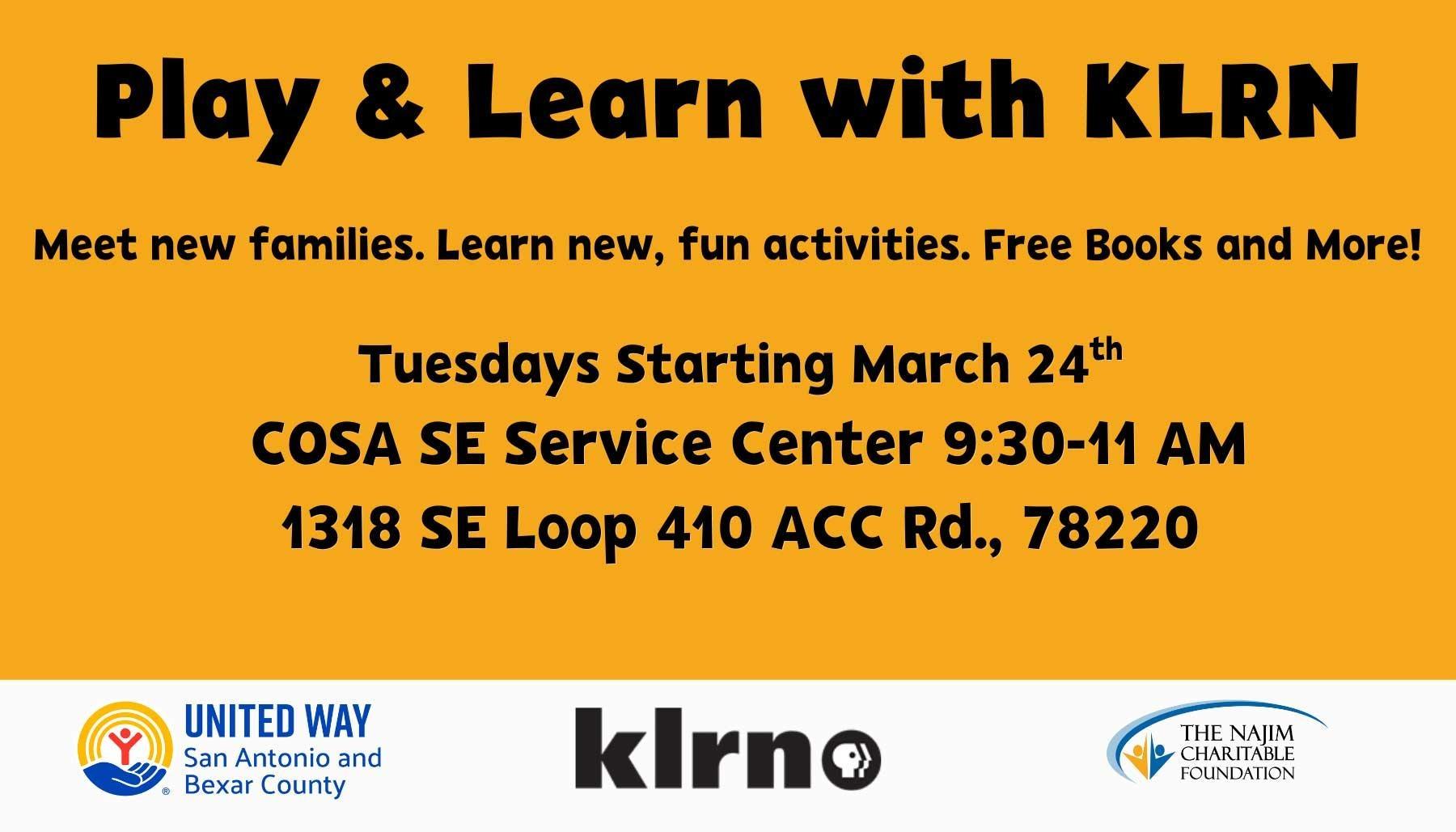 KLRN’s Play & Learn Program is a free, 8-week program designed for parents with young children. Join us Tuesdays at this location beginning March 24.