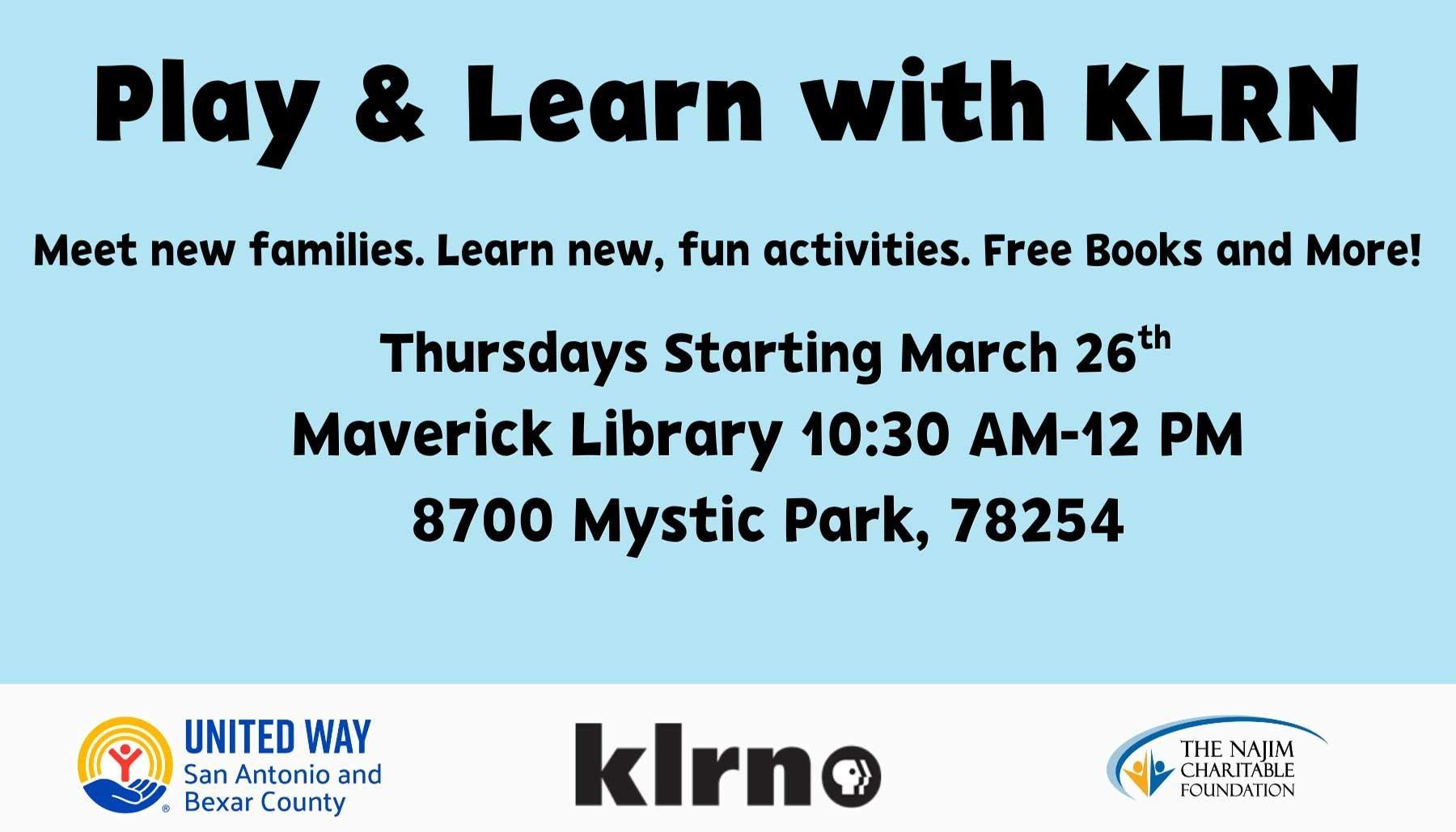 KLRN’s Play & Learn Program is a free, 8-week program designed for parents with young children. Join us Thursdays at this location, beginning March 26.