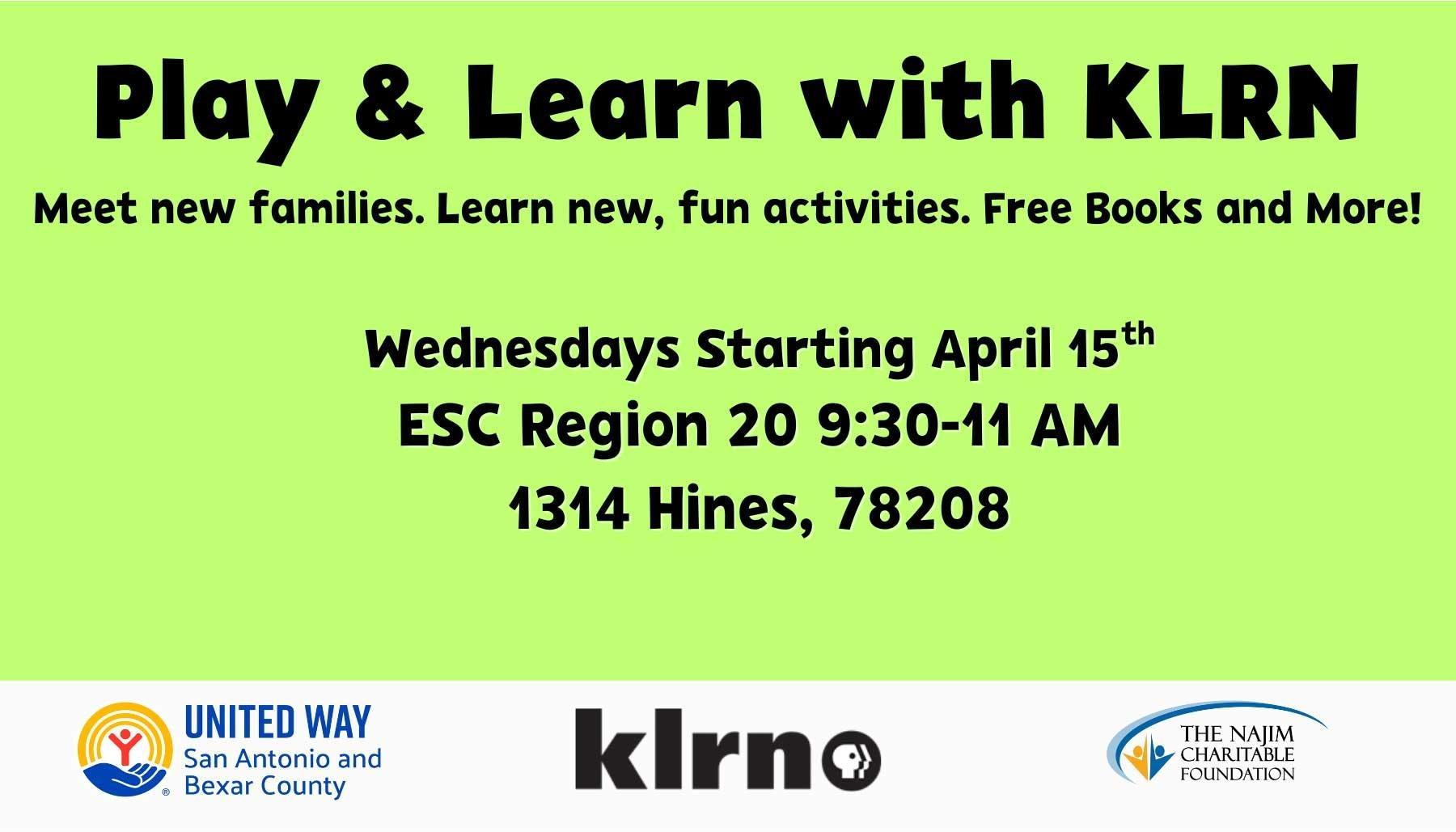 KLRN’s Play & Learn Program is a free, 8-week program designed for parents with young children. Join us Wednesdays at this location beginning April 15.