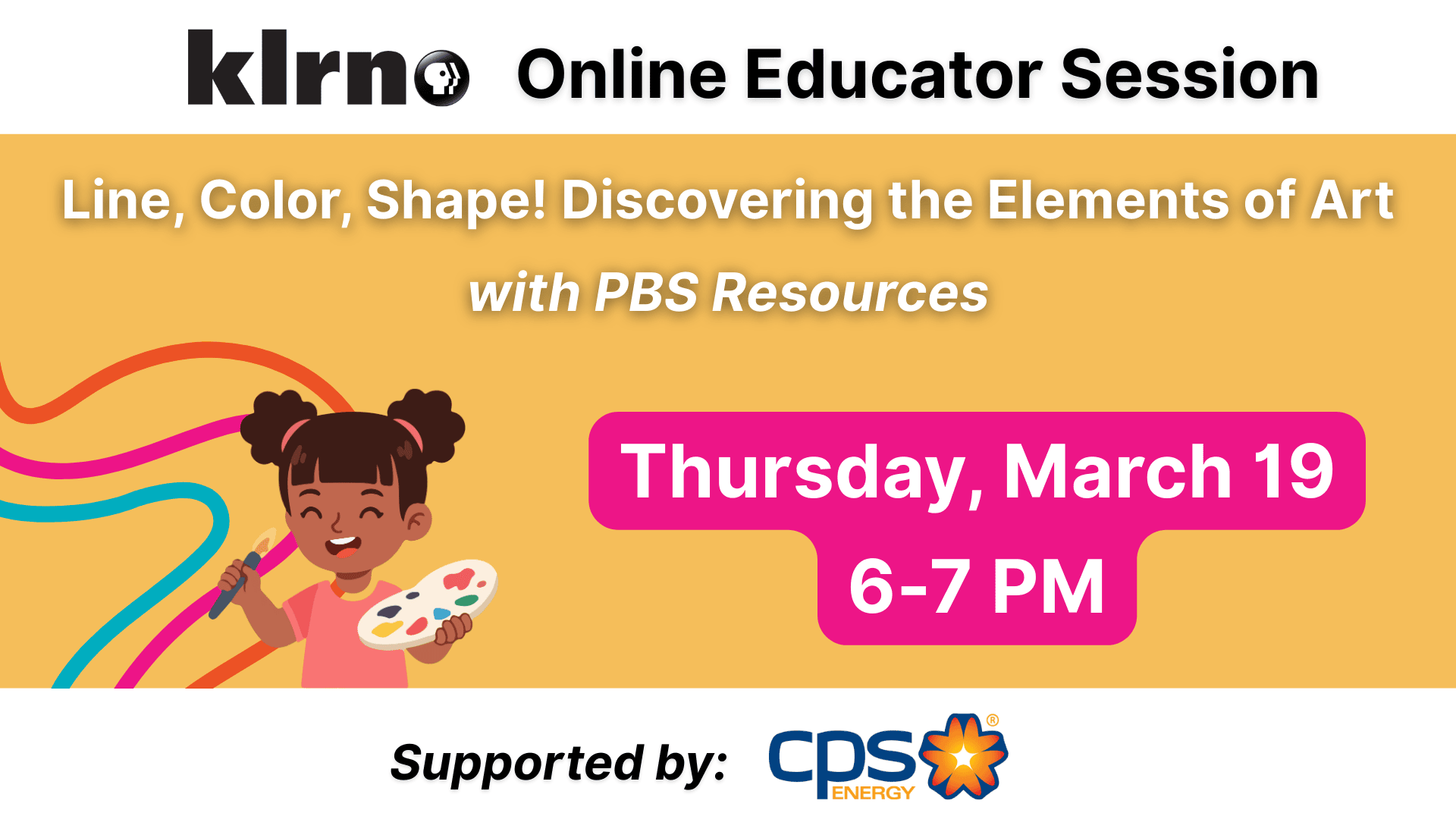 Join KLRN for a session that explores the Elements of Art with special guest speaker Ms. Dory Williams from Clarity Child Guidance Center. This session is geared toward early childhood educators, but all are welcome to attend.